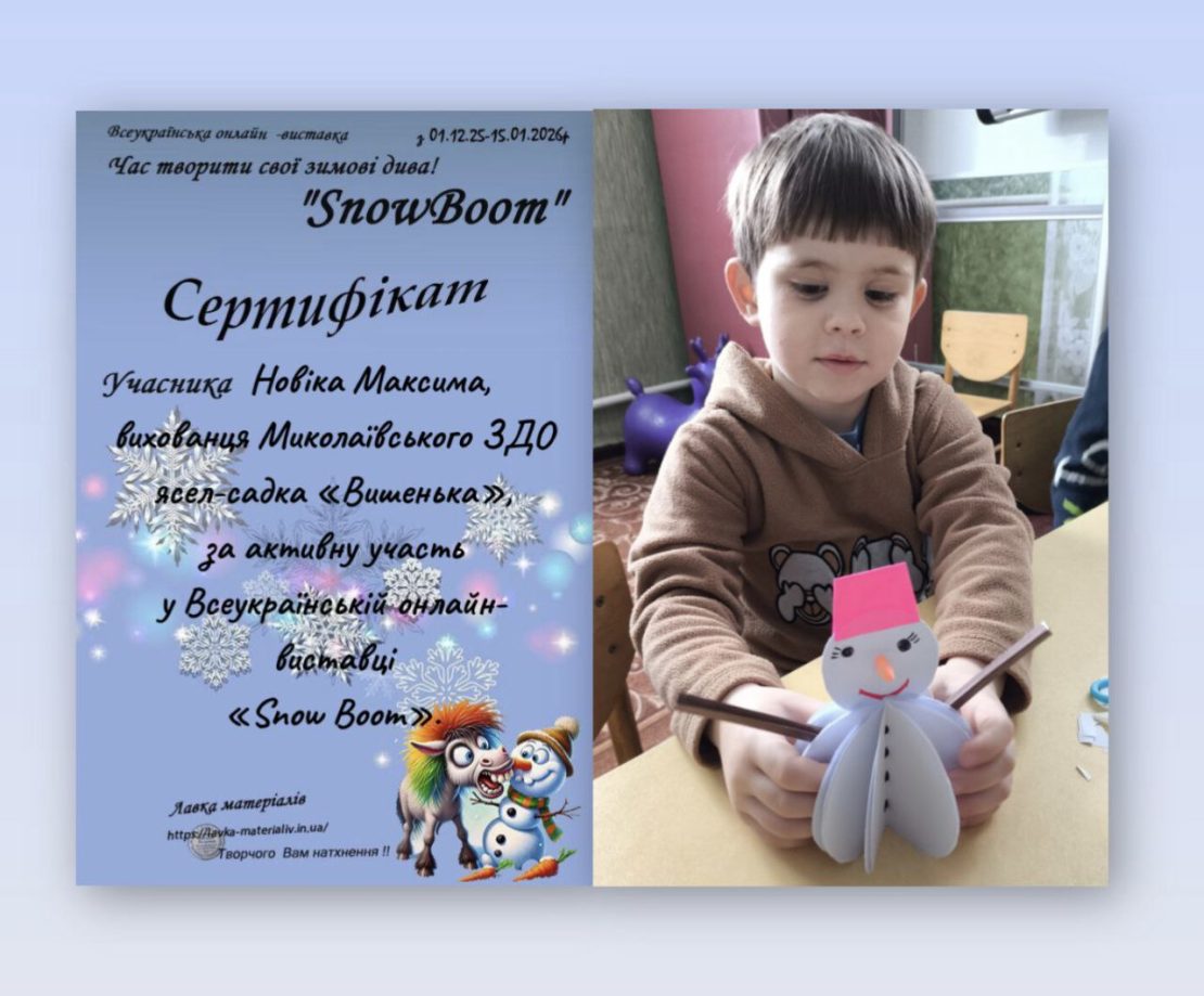 Зима — це час чудес, а наші малята — справжні маленькі чарівники! Вихованці нашого садочка не просто створили власну зимову казку, а й гідно представили наш заклад на Всеукраїнському рівні, взявши участь в онлайн-виставці «Сніговий бум SnowBoom».